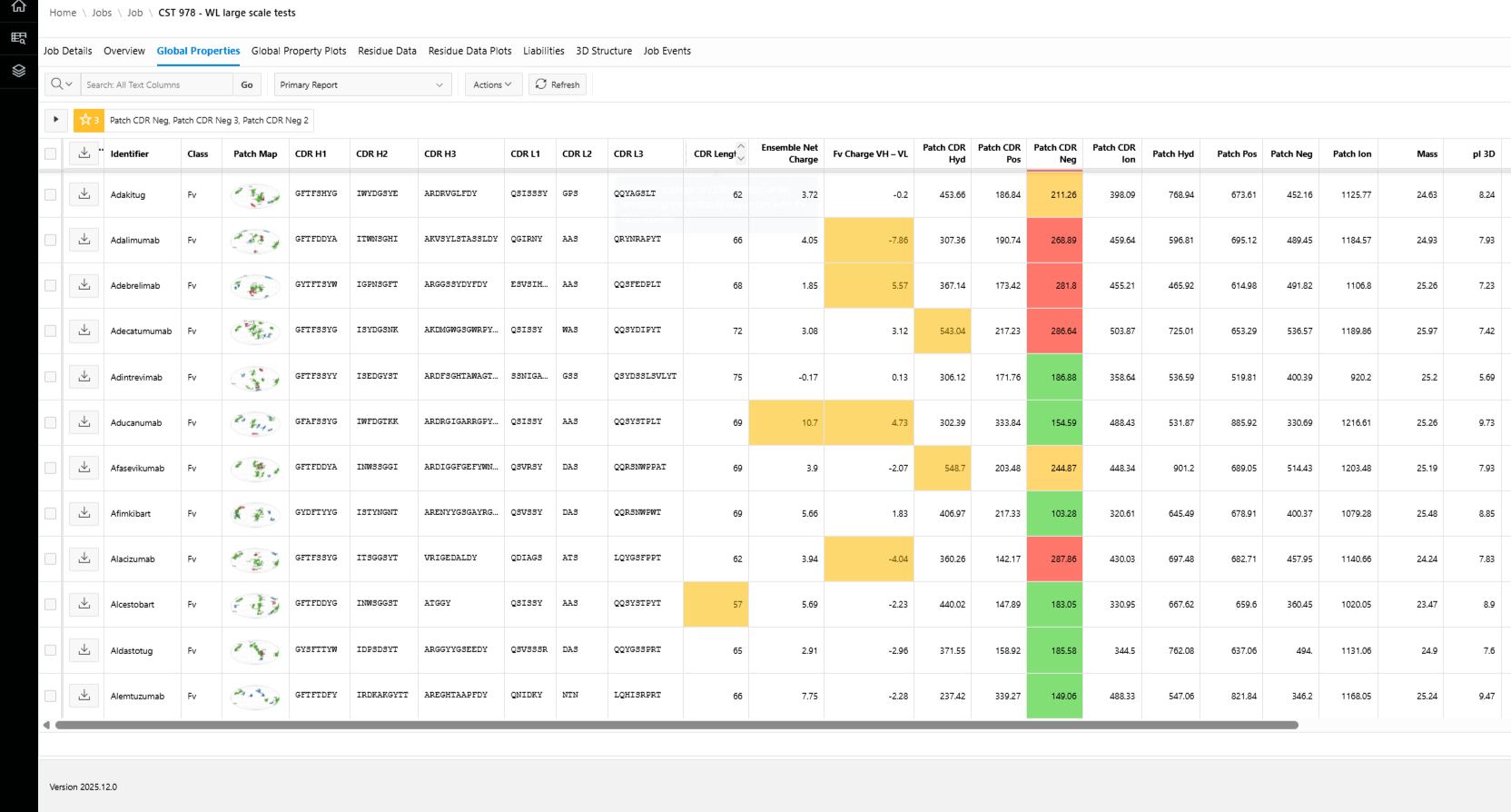 These descriptors feed into developability assessments (aggregation risk, viscosity potential, clearance risk, manufacturability) and are systematically compared against clinical-stage antibodies³, allowing researchers to interpret predicted properties in the context of known therapeutic benchmarks.